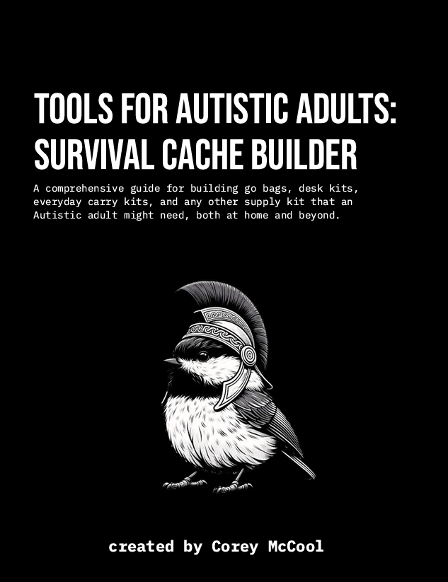 The Survival Cache Builder is a comprehensive guide I created (as a fellow Autistic adult, Corey McCool) to help you design and build personalized regulation kits. Whether it's a go bag, a desk kit, an everyday carry kit, or a cache for your car, this tool helps you prepare for any situation.